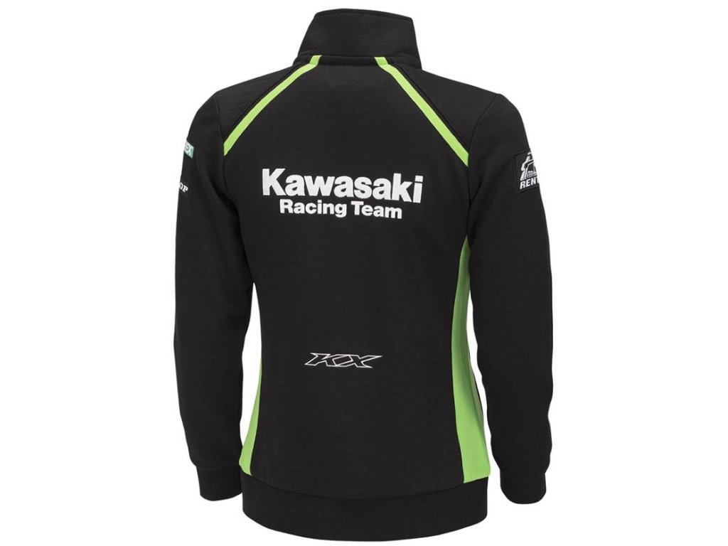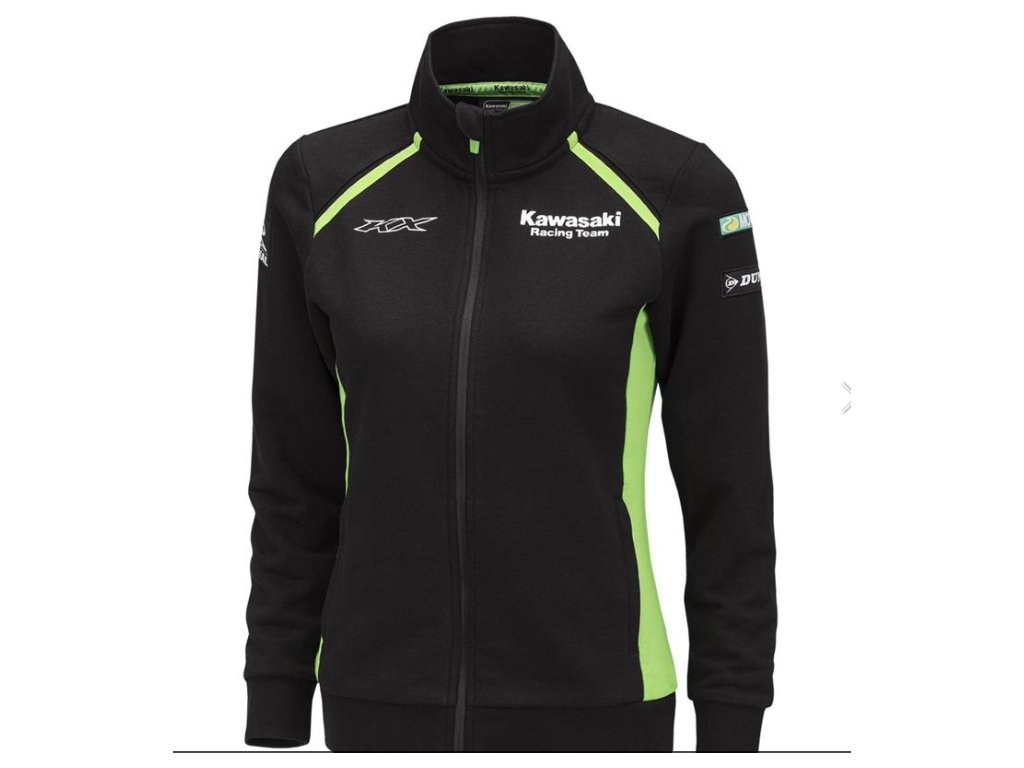 Stylová dámská mikina vyvedená v originálních týmových barvách a grafice Kawasaki Racing Team v MXGP 2024 se zapínáním na zip, vnějšími kapsami na zip, stojáčkem, žebrovanými lemy a manžetami.