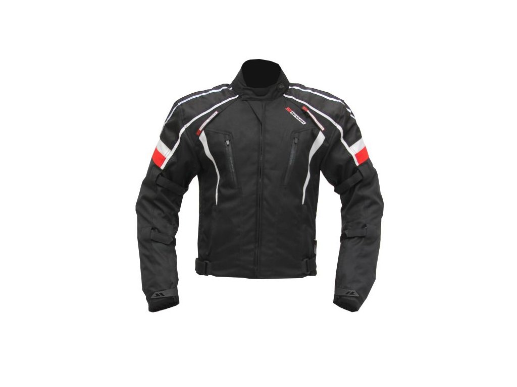 Pasová textilní moto bunda sportovního střihu a designu s vyjímatelnou thermo vložkou a kompletní sadou protektorů.